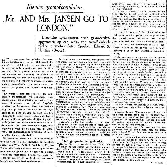 -LEVENDE TALEN – Berichten en Mededelingen van de Vereniging van Leraren in Levende Talen, Jaarboek 1937, pag.’s 323-330.